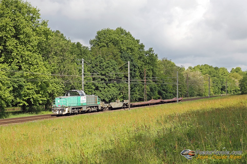 Mené par la BB 7306 le 12 mai 2025, un Intercités Bordeaux-Marseille longe le canal au sud de Pompignan (82).