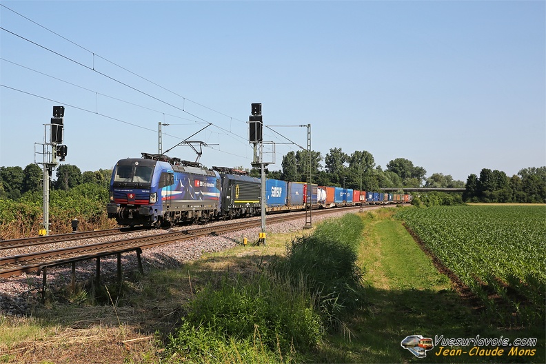En tête d'une lourde rame du service combiné, la nouvelle Vectron 193 543 CFF Cargo International louée chez SüdLeasing , qui arbore la dernière livrée Alppiercer 3 XLoad et le marquage spécial "BorderlessSwissQuality" à la place du logo habituel, descend la Rheintalbahn à hauteur d'Hecklingen (Allemagne) le 17 juin 2025.