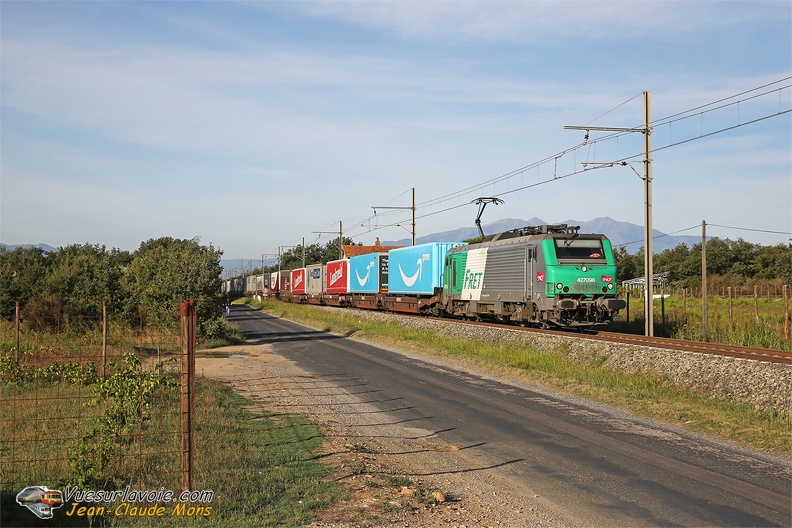 Venant de franchir le tunnel du Perthus, une Euro 6000 de Captrain España passe à Touillas (66), sur la LGV Figueres-Perpignan, le 17 septembre 2025, en tête d'une rame du combiné en provenance de Barcelone, qui sera reprise au Soler par un autre opérateur.