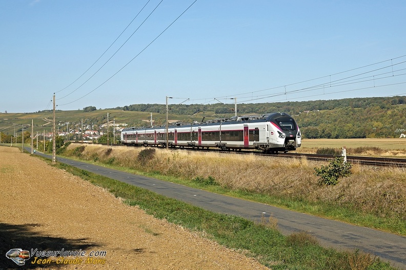 Parti de Paris Est à destination de Culmont-Chalindrey, le Coradia Liner 85017/018 passe à Montgazon (77) où les travaux d'électrification de la L4 sont en cours de réalisation.