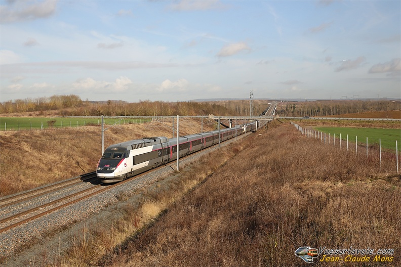 Parée du logo de l'Union Européenne présidée alors par la France, la rame TGV 2N 4706 passe à Villeroy (77) alors qu'elle remplace un ICE de la relation Francfort-Paris, le 5 février 2022.