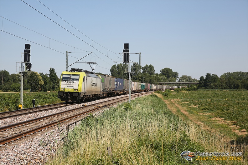 La Traxx 186 320 DBCF, qui achemine une rame de couverts en provenance de Lille Délivrance et à destination de Clermont Les Gravanches, arrive à Louvres (95) le 6 juillet 2023.