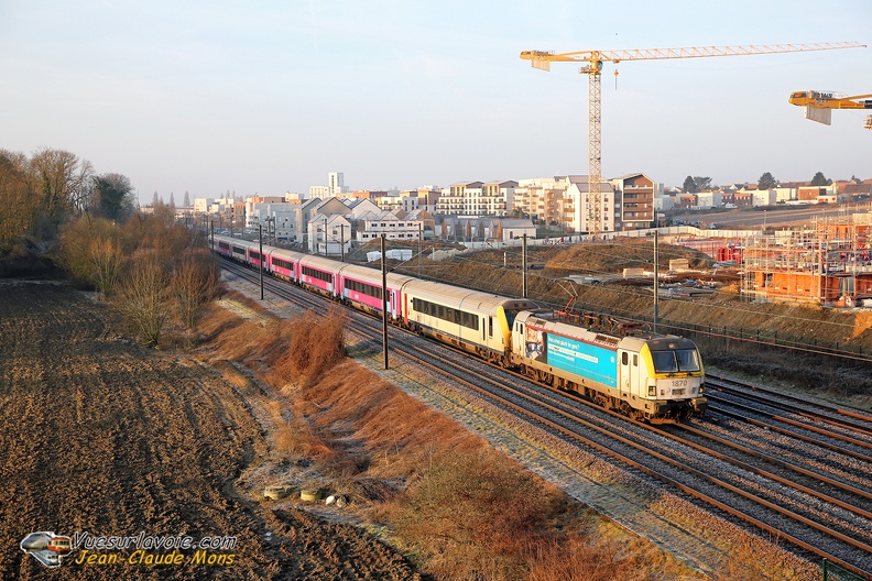 Le 19 février 2025 au matin, la Traxx 186 306 DBCF longe les chantiers immobiliers de Louvres (95), en charge de l'acheminement de la rame Transfennica Bayonne-Anvers.