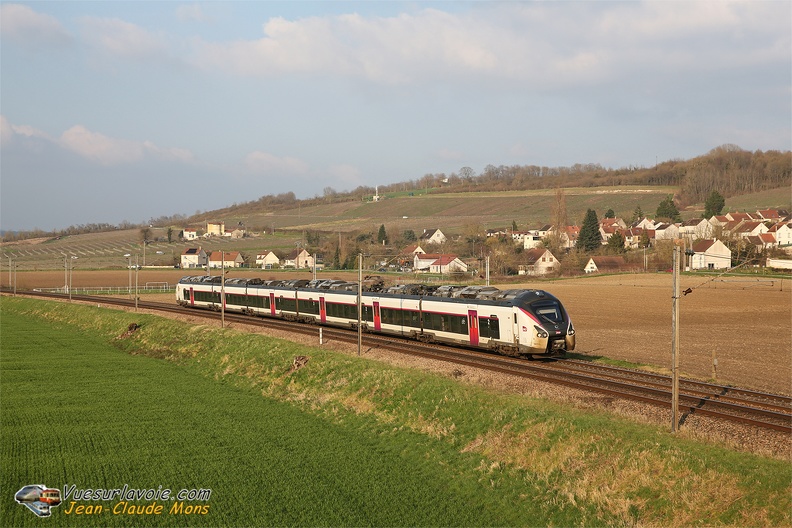 Le Coradia B 85075/076 aux couleurs Fluo Grand Est passe à Reuilly-Sauvigny (02) le 17 février 2025 alors qu'il assure un TER Vallée de la Marne Bar le Duc-Paris Est.