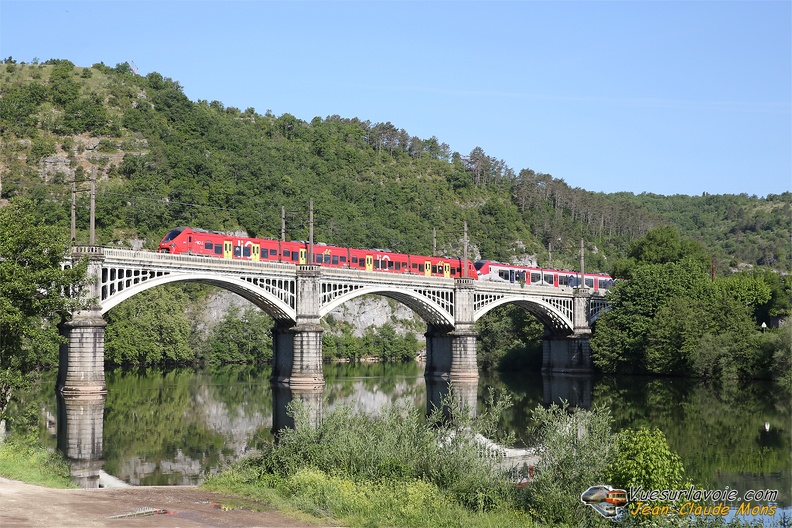 La BB 26015 et son coupon Corail, qui assurent l'Intercités 3605 Paris-Toulouse au look bien défraîchi, passent sous le château de Mercuès (46) le 14 mai 2025, peu avant l'arrêt à Cahors