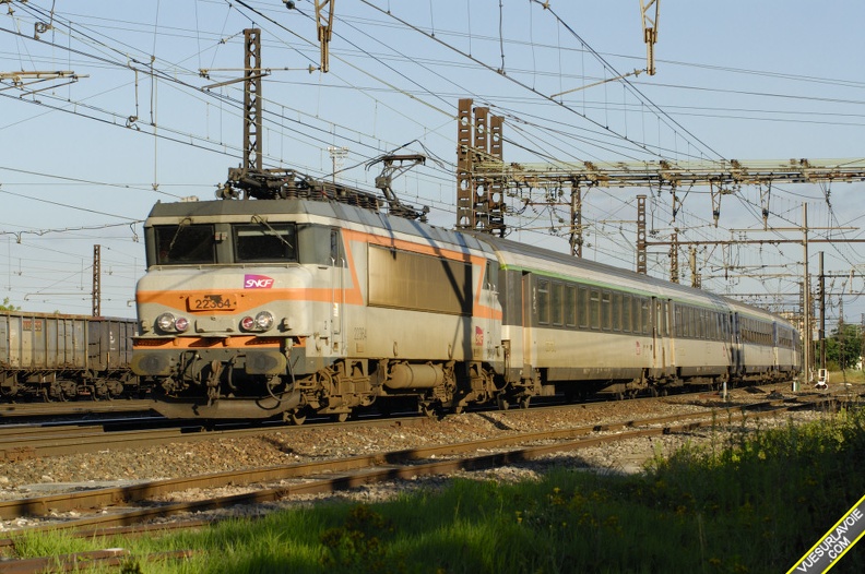 La 7266 passe Ambérieu en tête du Irun - Genève, assuré par une rame de voitures à sièges inclinables et de voitures couchettes.