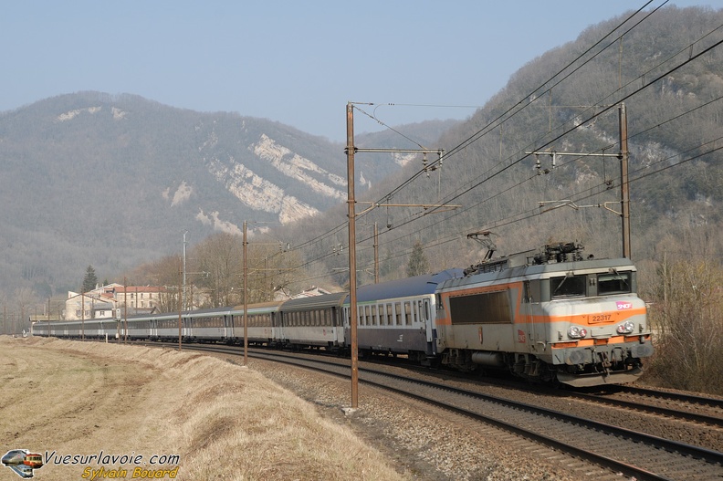 En tête d'une rame de Corail à sièges inclinables, la BB7256 assure un W de Bourg St Maurice à Paris Austerlitz. Elle est vue dans la courbe de Montferrand.